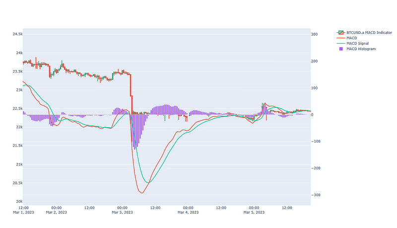 For instance, using the MACD chart earlier, it can be seen that the BTCUSD dip observed on March 3, 2023 between 00:00 and 12:00 is shown with a comparatively larger histogram size.