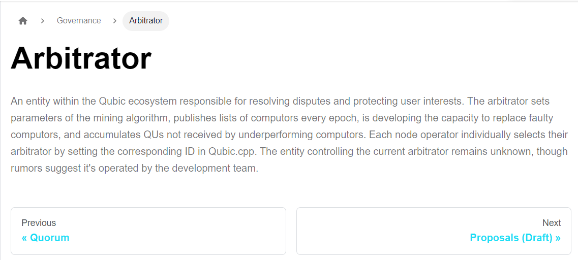 However, Qubic's inclusion of an Arbitrator feels off. The Arbitrator holds enormous power in the network, and receives any Qubic that hasn't been earned by Computors. Yet, in all the documentation, there is one paragraph about Arbitrators, and I haven't really found much in the way of code for it.
