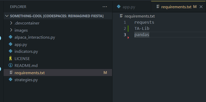 requirements.txtpandaspip install -r requirements.txtHere’s what your requirements.txt should look like now:
